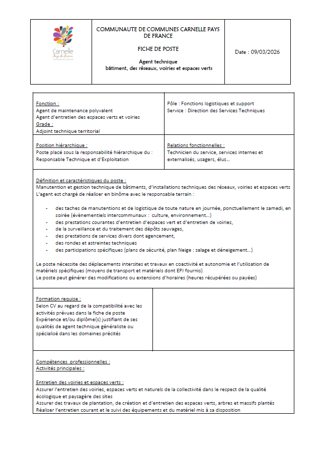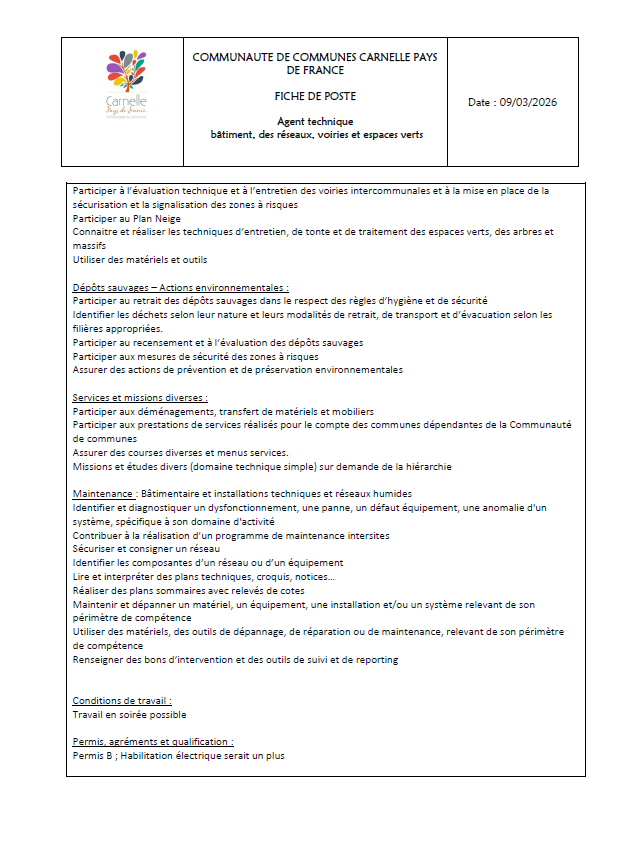 La Communauté de Communes Carnelle Pays-de-France recrute un agent des services techniques pour renforcer ses équipes.